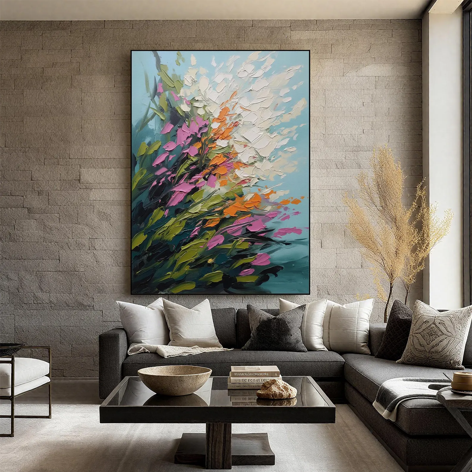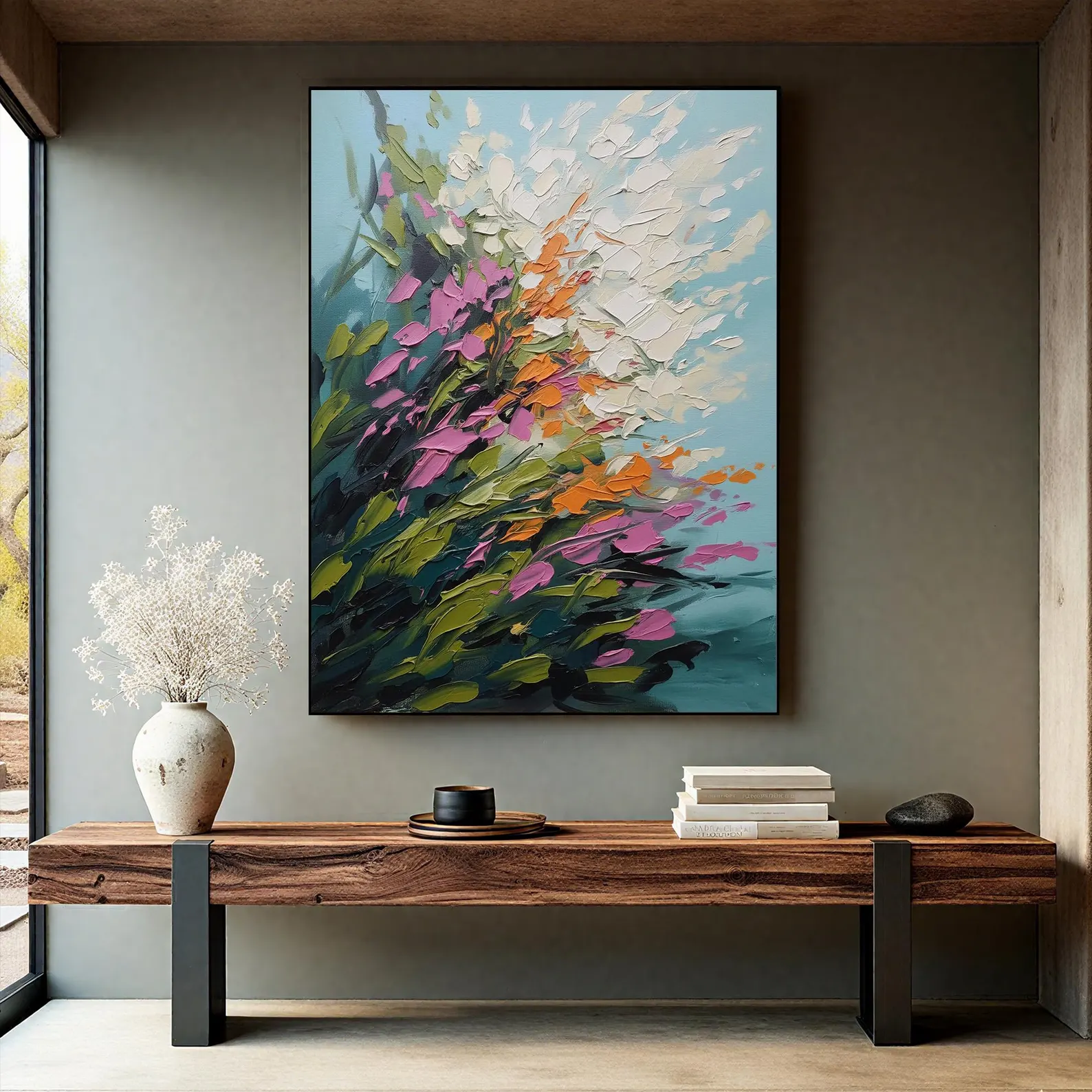Custom Wall Art Pink Floral Painting Modern Living Room